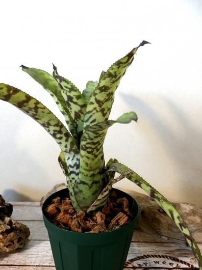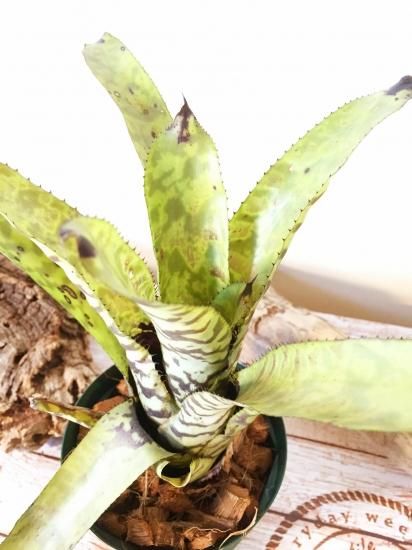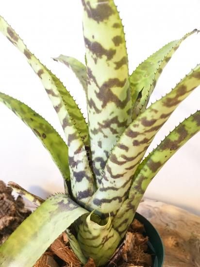 明るいグリーンの葉に琥珀色の虎模様が入る美しい交配種。中型サイズのエクメアでその色合いから人気も高い。