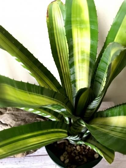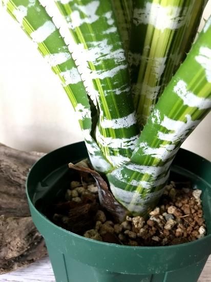 葉は硬質で、葉針はしっかりと見られます。葉にははっきりとした斑が入り、白い縞模様も等間隔ではっきりと現れる非常に美しい品種です。
