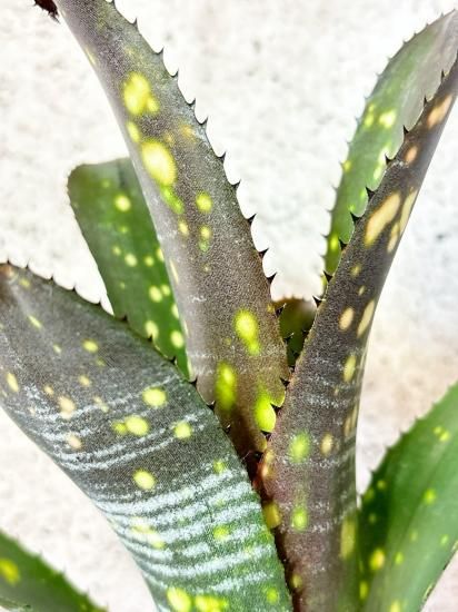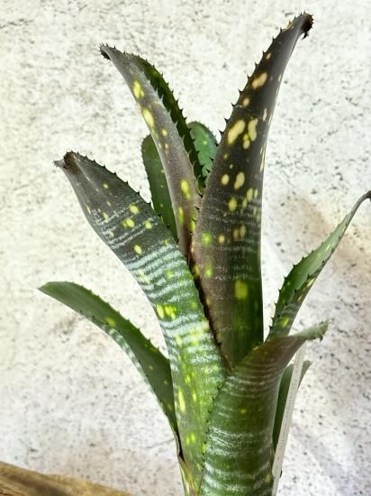 葉は硬質で幅広。赤黒い葉には白く美しいスポットが入っています。