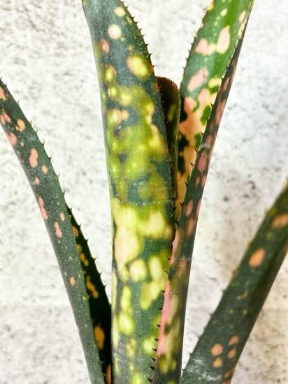 赤黒い葉にピンク色のスポットが大きく入る人気の交配種。名前のインセンディアリーデライトは焼夷弾という意味があります。
