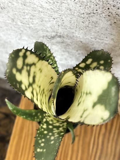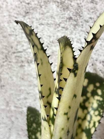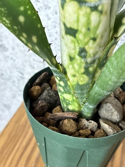 葉は硬質で葉針はしっかりとしています。葉の色は濃いグリーンに綺麗な白い斑が多く入りとても美しいです。