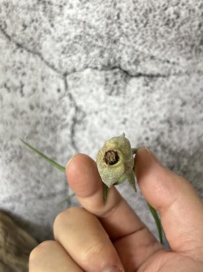 葉は多肉質で、やや硬質。まさにブルボーサとイオナンタの特徴掛け合わせた姿をしており、根本は壺型に膨らみ、葉は短くうねる多肉質で根元に白いトリコームとブルボーサ独特の質感を持っています。
